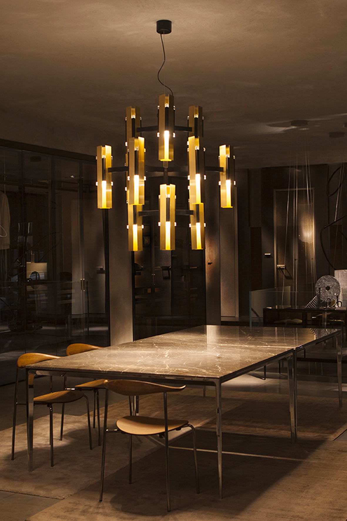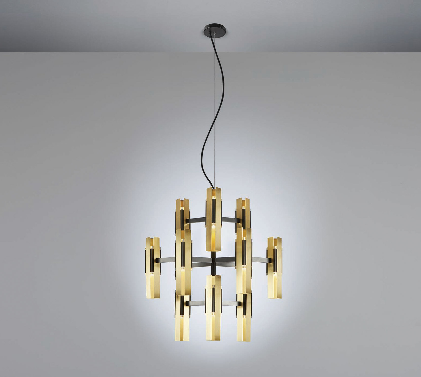 Tooy EXCALIBUR CHANDELIER 12 Chandelier | Pendant, Metal, Brass and PMMA Construction, Sand black + brushed brass Trim, 10W, 2700°K, IP40, Suspension Mounted, Integral Control Gear, Phase Cut Dimmable.