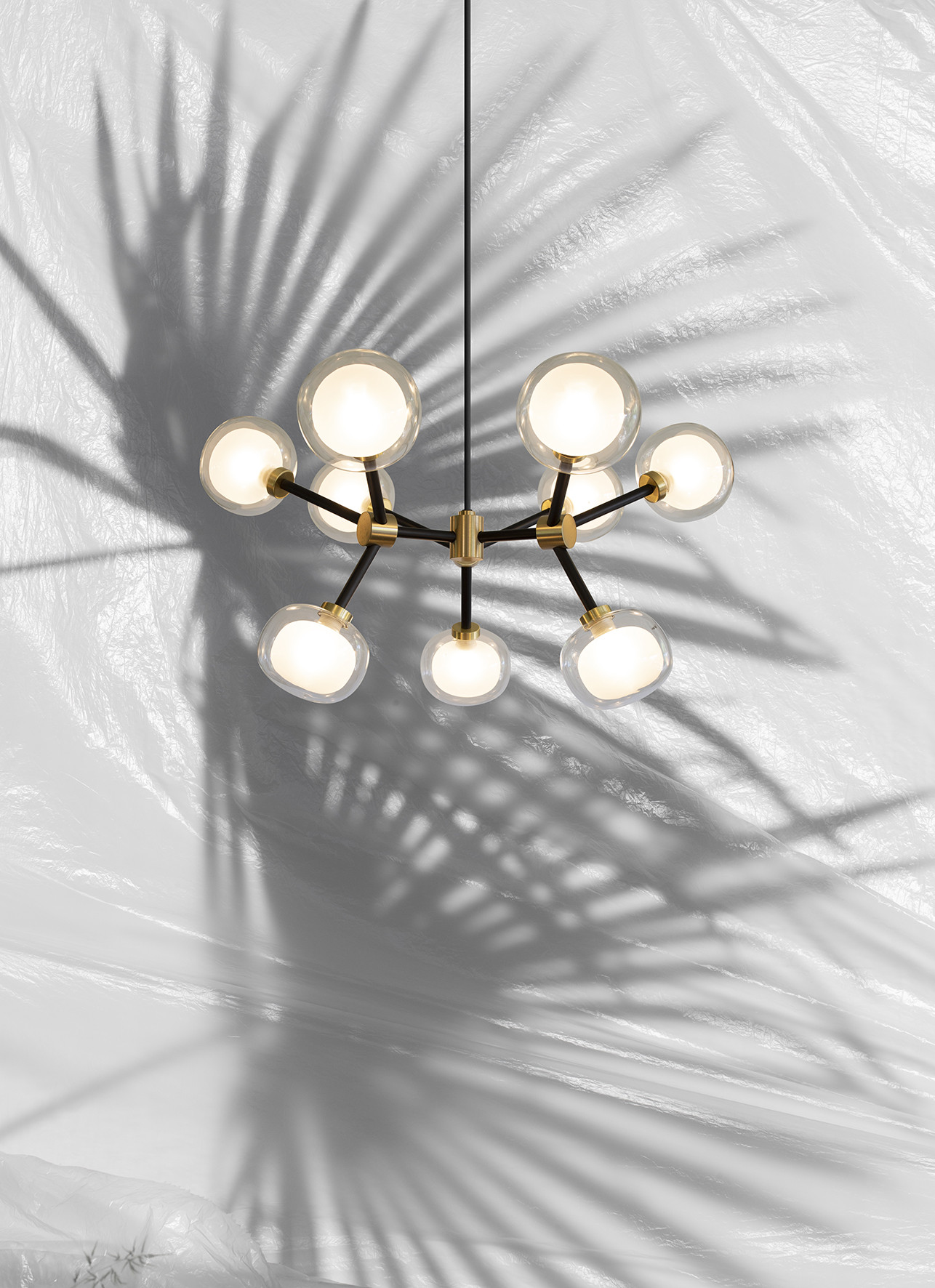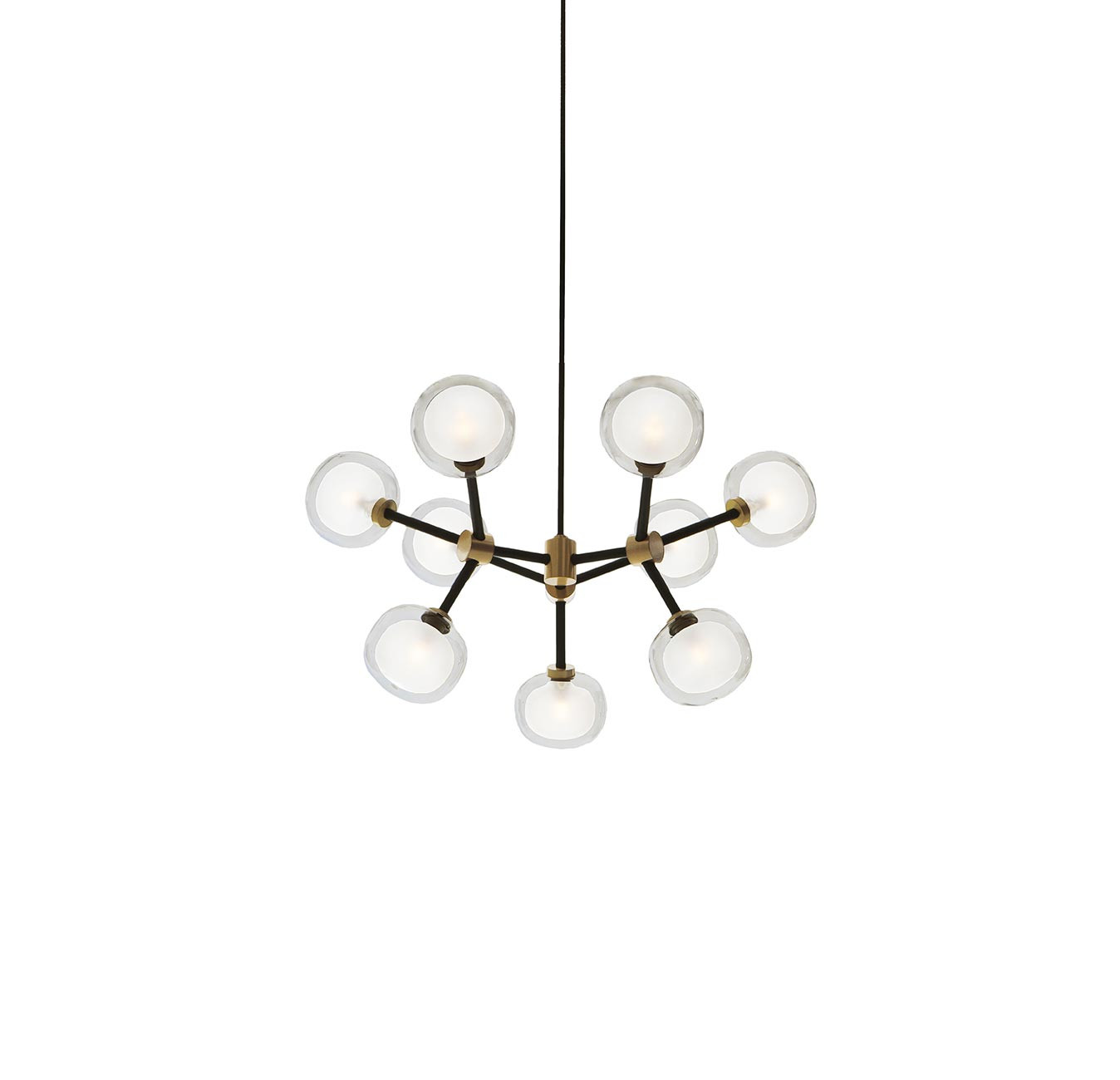 Tooy NABILA CHANDELIER 9 Chandelier | Pendant, Metal, Brass, Glass Construction, Matte black + brushed brass + clear glass Trim, G9 Lamp Holder, IP40, Suspension Mounted, NO LAMP INCLUDED.
